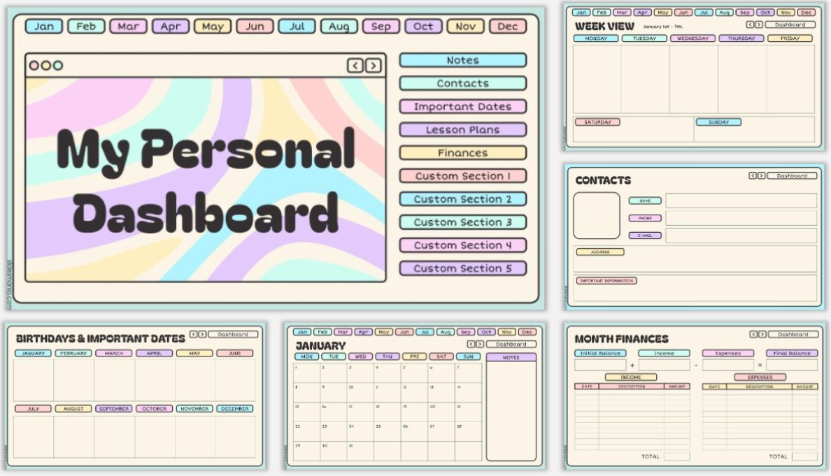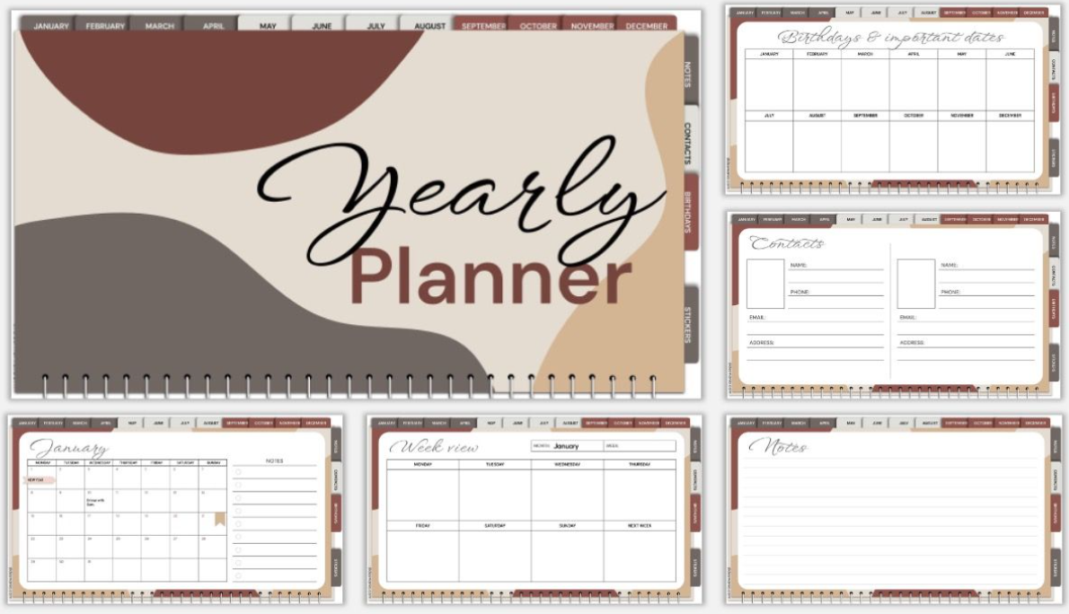 월간뷰, 주간뷰, 노트 구성, 연락처 섹션, 생일과 기념일, 디지털 스티커 섹션으로 구성되어 있습니다. 이 다이어리는 살싹 나이가 있는 분에게 추천드립니다. 첫 번째 파스텔 톤은 나이 들어서 쓰기 조금 민망할 수 있겠네요. 기본에 충실하고 색상이 너무 칙칙하다고 느껴진다면 색상테마를 변경하여 자신만의 스타일대로 만들어 보세요.