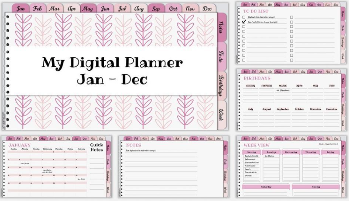 하이퍼링크가 포함된 이 다이어리는 Kaite가 만들었다고 하네요. 슬라이드는 표지, 월간, 노트, 생일, 할 일 목록, 주간뷰로 이루어져 있습니다. 유튜브에 템플릿을 수정하여 쉽게 사용자 설정하는 영상을 제공하고 있습니다.